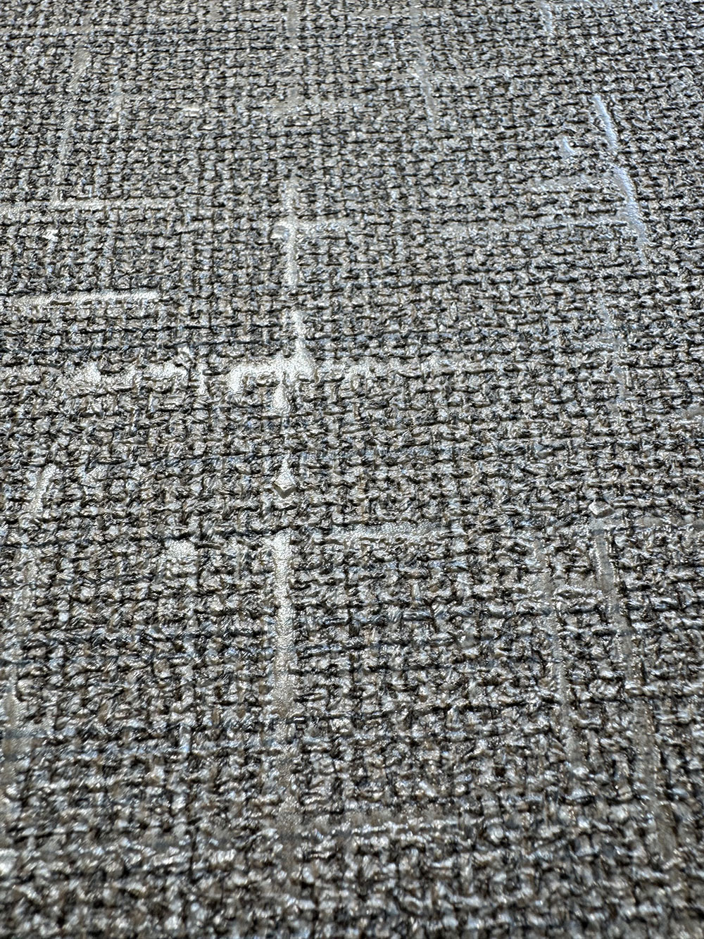 Luxus vlies tapéta vinil felülettel - szürke/szürke-bézs durva szövet textúra, csillogó ezüst háttérrel. A tapéta színei és tükröződései a fénytől függően változnak.