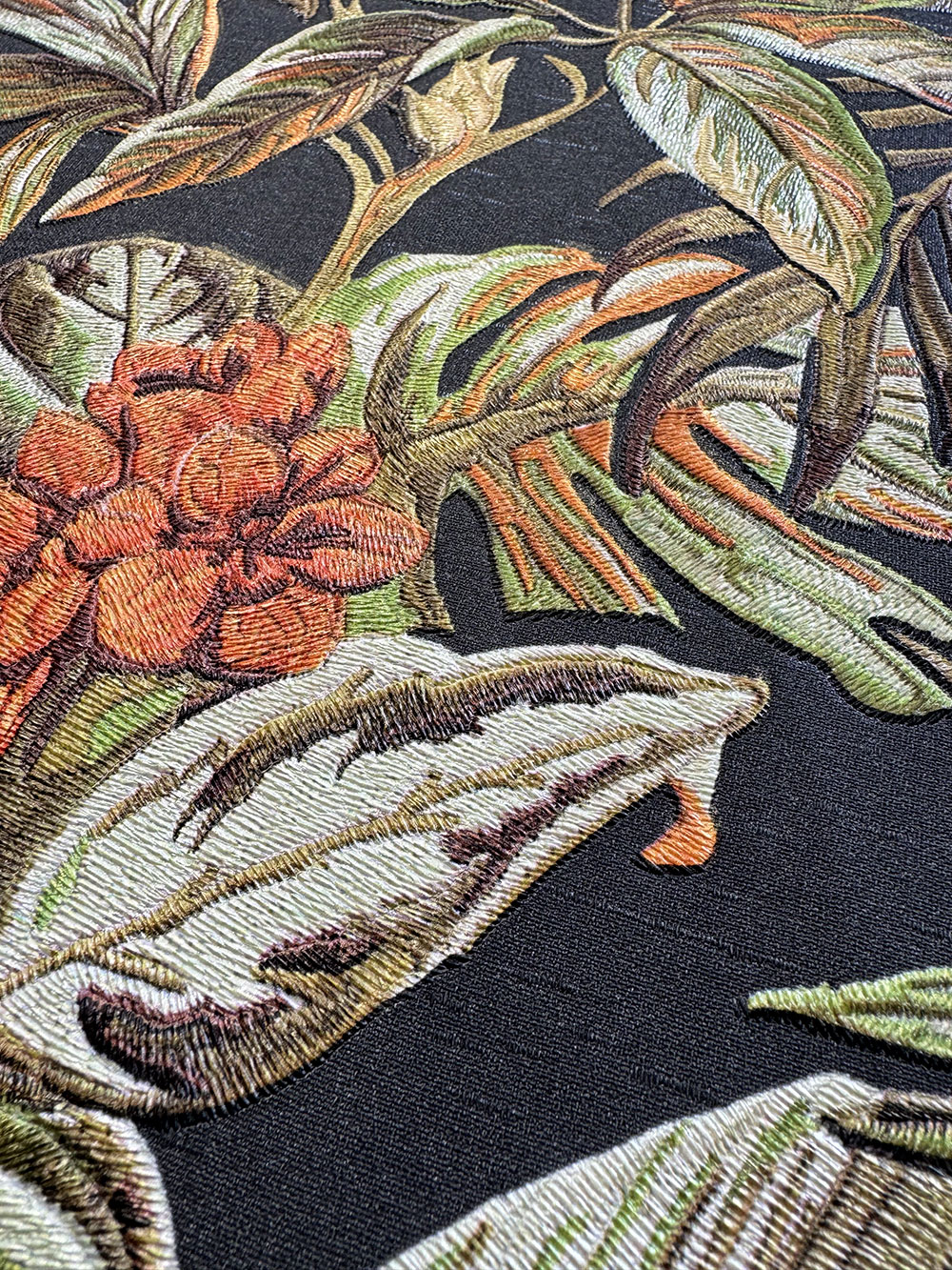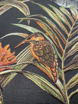 Vlies tapéta vinil felülettel, fekete háttér finom félfényű, fémes textúrával, főként zöld és narancssárga árnyalatokban. A tapéta színei és tükröződései a fénytől függően változnak.