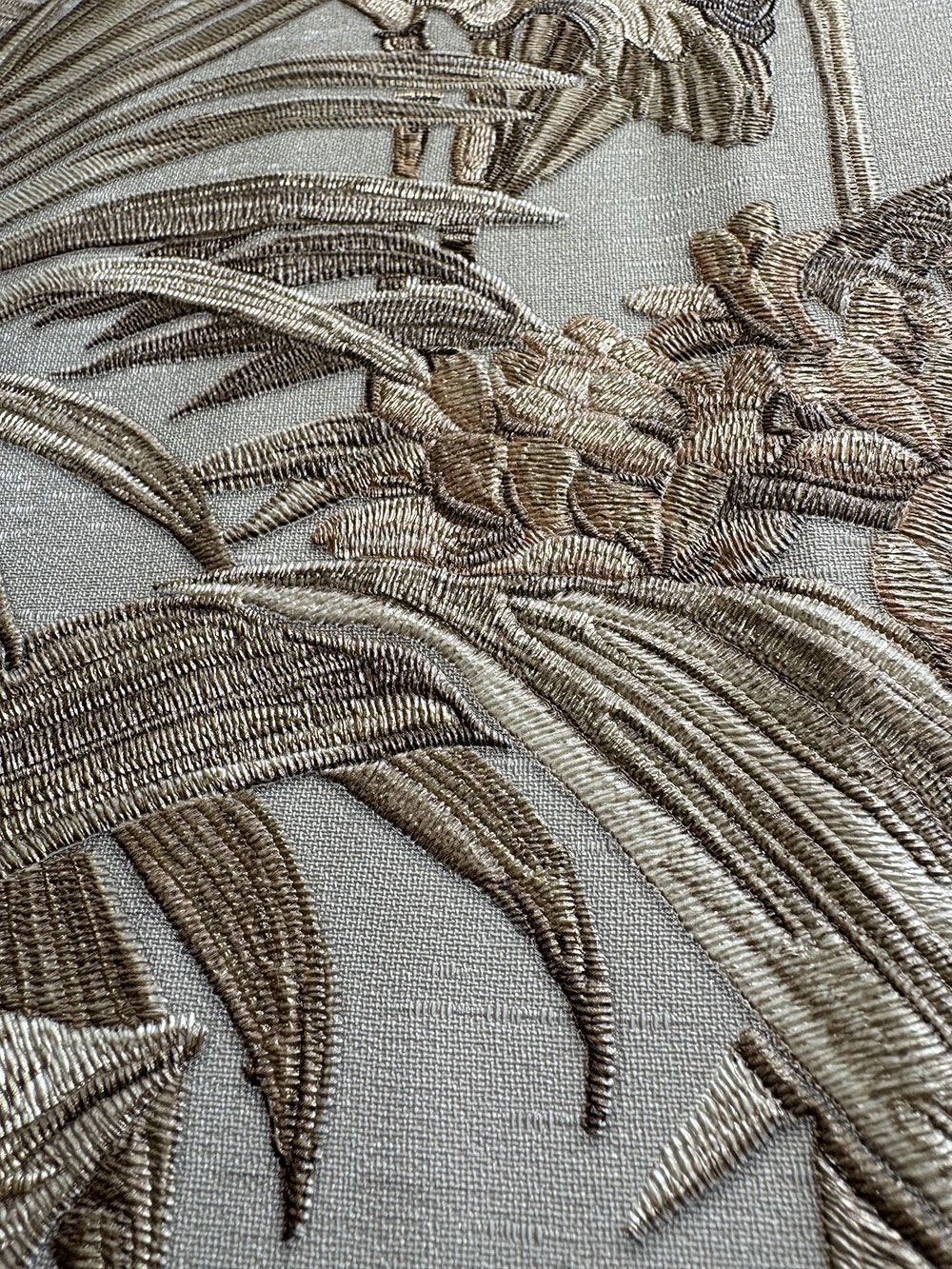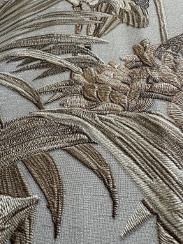 Luxus, vlies tapéta vinil felülettel - világosszürke háttér finom félfényes, metálbarna-bézs árnyalatú textúrákkal. A tapéta színei és tükröződései a fénytől függően változnak.