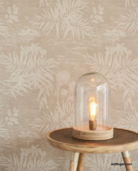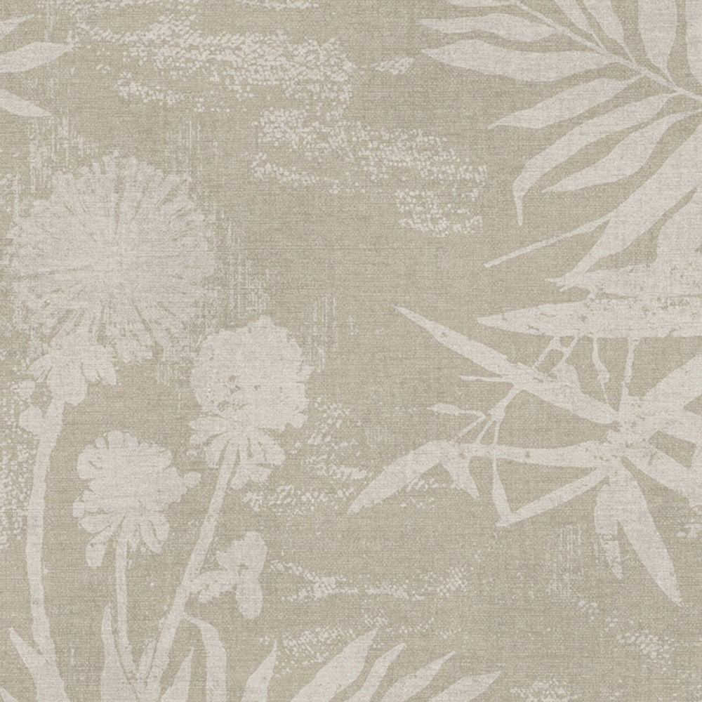 Növényi motívumok sima matt vlies tapétán szürkés-bézs árnyalatokban.