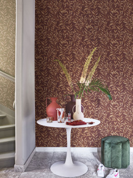Barna-piros finom szerkezetű vlies tapéta vinil felülettel, gallyak, levelek motívumokkal, terrakotta árnyalatban.