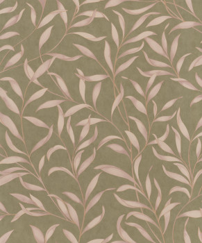 Zöld finom szerkezetű vlies tapéta vinil felülettel, gallyak, levelek motívumokkal, rózsaszín árnyalatokban.