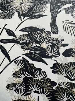 Bézs színű vlies tapéta fekete, bézs és lágy fémes arany árnyalatú virágokkal és levelekkel.