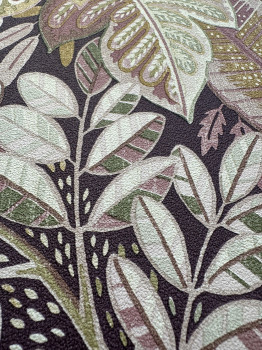 Vlies tapéta, levélmintás, lila, bézs és okker árnyalatok.