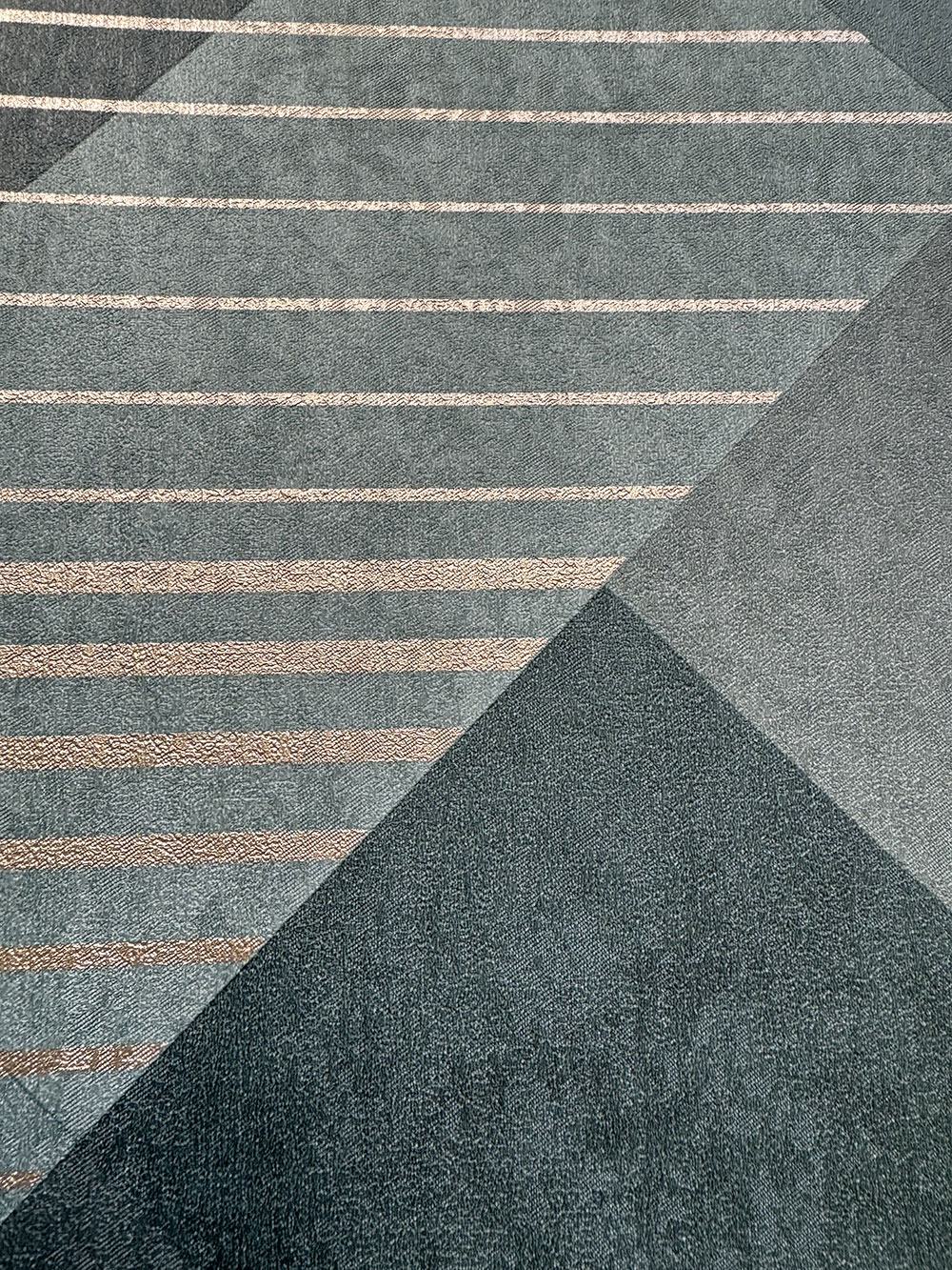 Zöld vlies tapéta, geometrikus mintázat, világos arany színű vonalak.