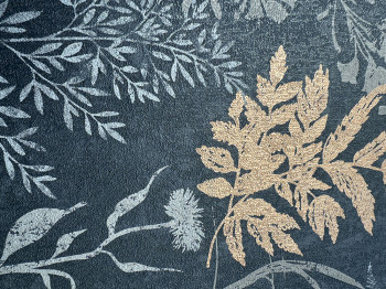 Sötétkék textúrájú vlies tapéta, stukkóutánzat, levél- és virágdekor a kék, a szürke és a bronz árnyalataiban.