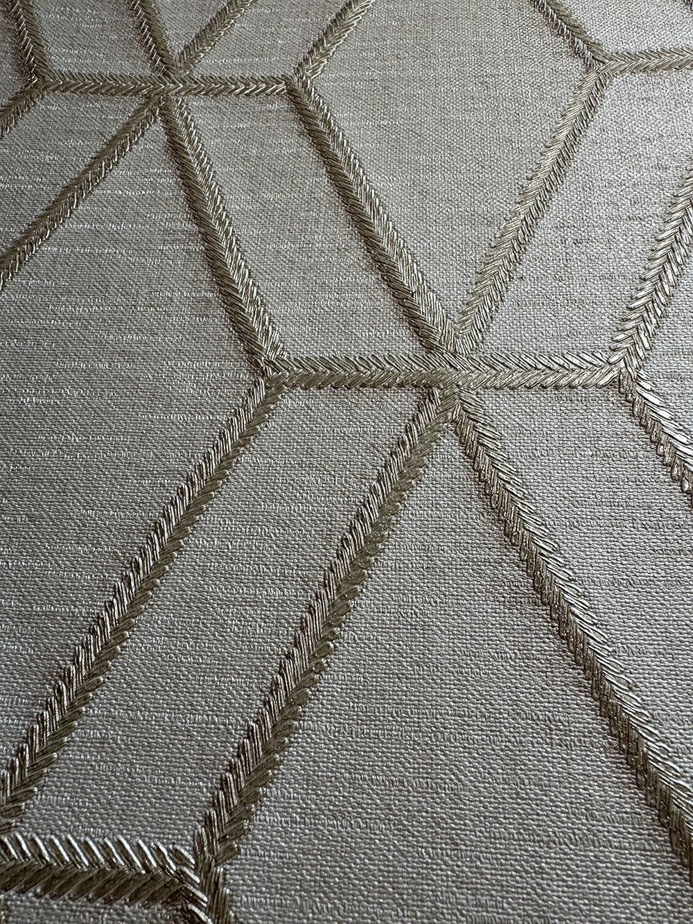 Luxus, vlies tapéta vinil felülettel - selymes bézs szövet kialakítása, finom félfényes, a minta körvonalai - fémes metál arany „varrás”.