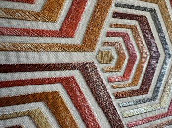 Luxus, geometrikus, vlies tapéta vinil felülettel. Bézs háttér, vörös, narancssárga, szürke árnyalatú minta, fémes fényű.