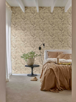 Vlies tapéta virágmintás bézs és barna árnyalatokkal - világos ecsetvonások, plasztikus hatás. A belső fotó csak illusztráció. Vincent Van Gogh - A virágzó körtefa című munkája ihlette.