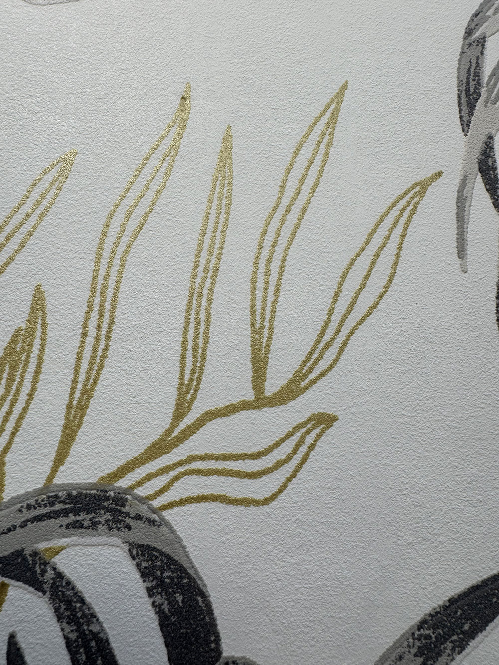 Krémszínű nem szőtt tapéta vinil felülettel, trópusi levelek motívumai szürke és okker árnyalatokban, helyenként aranyszínű kiemeléssel.