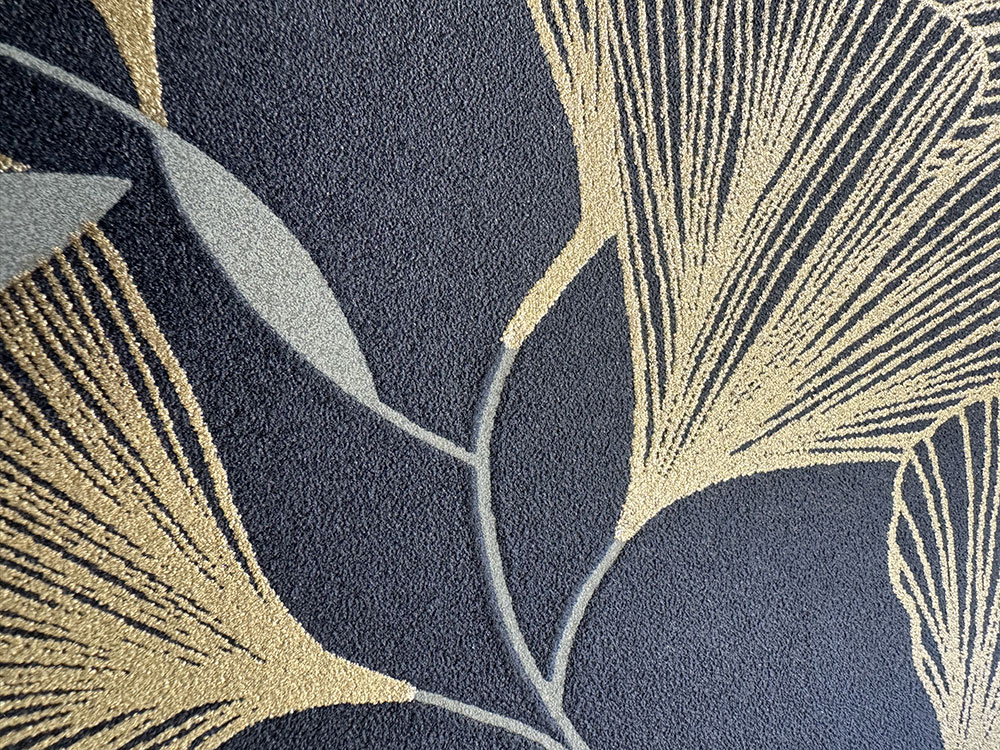 Zöld nem szőtt tapéta vinil felülettel, arany Ginkgo levelek motívumaival.