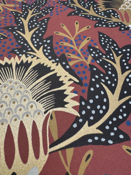 Burgundi gyapjú tapéta, szokatlan virágmintával, amelyet az afrikai batikolás ihletett, aranyszínű virágok és levélrészek, egyéb színek - kék, fekete, barna.
