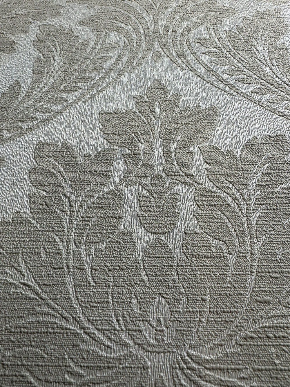 Bézs színű vlies tapéta barokk damaszt mintával, szövet textúrával, finom félfényű háttérrel.