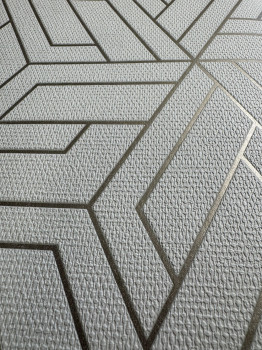 Fehér dombornyomott geometrikus vlies tapéta, arany körvonalakkal.