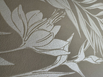 Matt bézs színű vlies tapéta, dombornyomott fényes levelekkel.