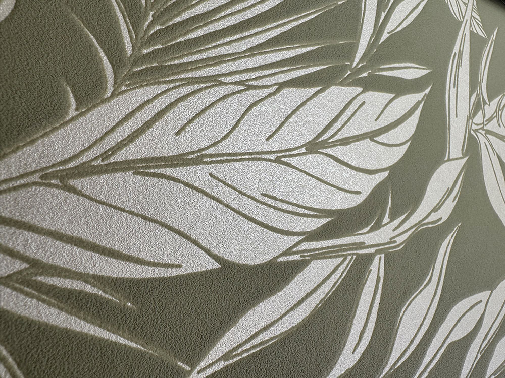Matt zöld vlies tapéta, dombornyomott fényes bézs levelekkel.