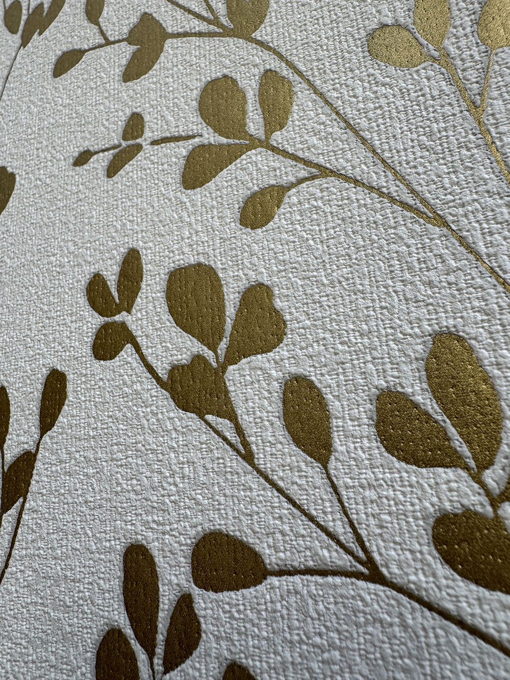 Texturált krémszínű vlies tapéta, dombornyomott arany ágak.
