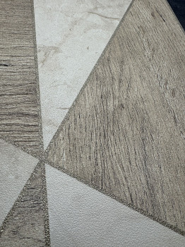 Geometrikus vlies tapéta, barna, bézs és szürke-fekete árnyalatok. Fa és márvány motívum, bézs színű fémes kontúrok.