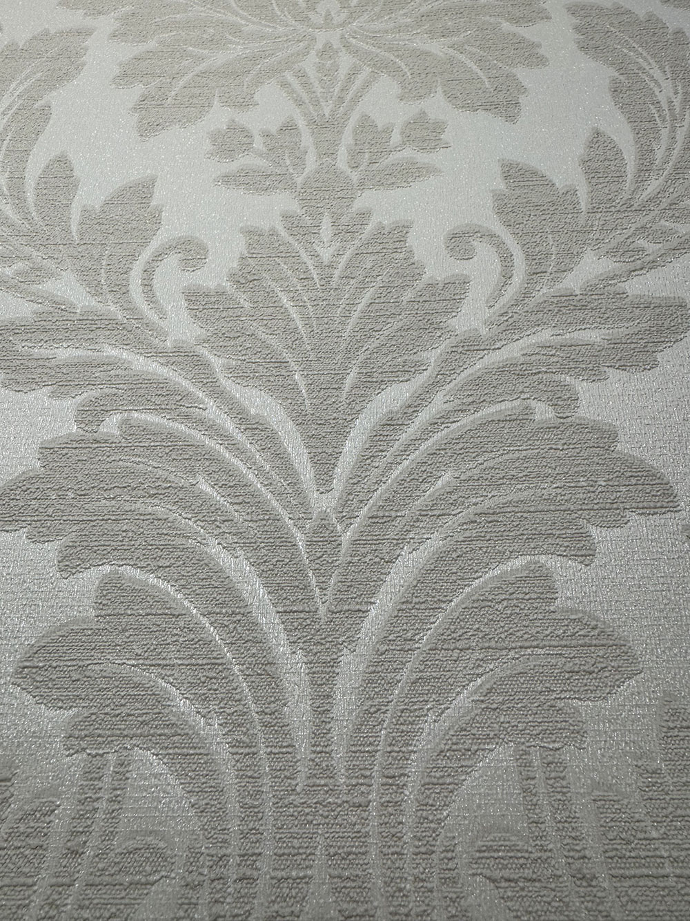 Fehér-krém vlies tapéta barokk damaszt mintával, szövet textúrával.