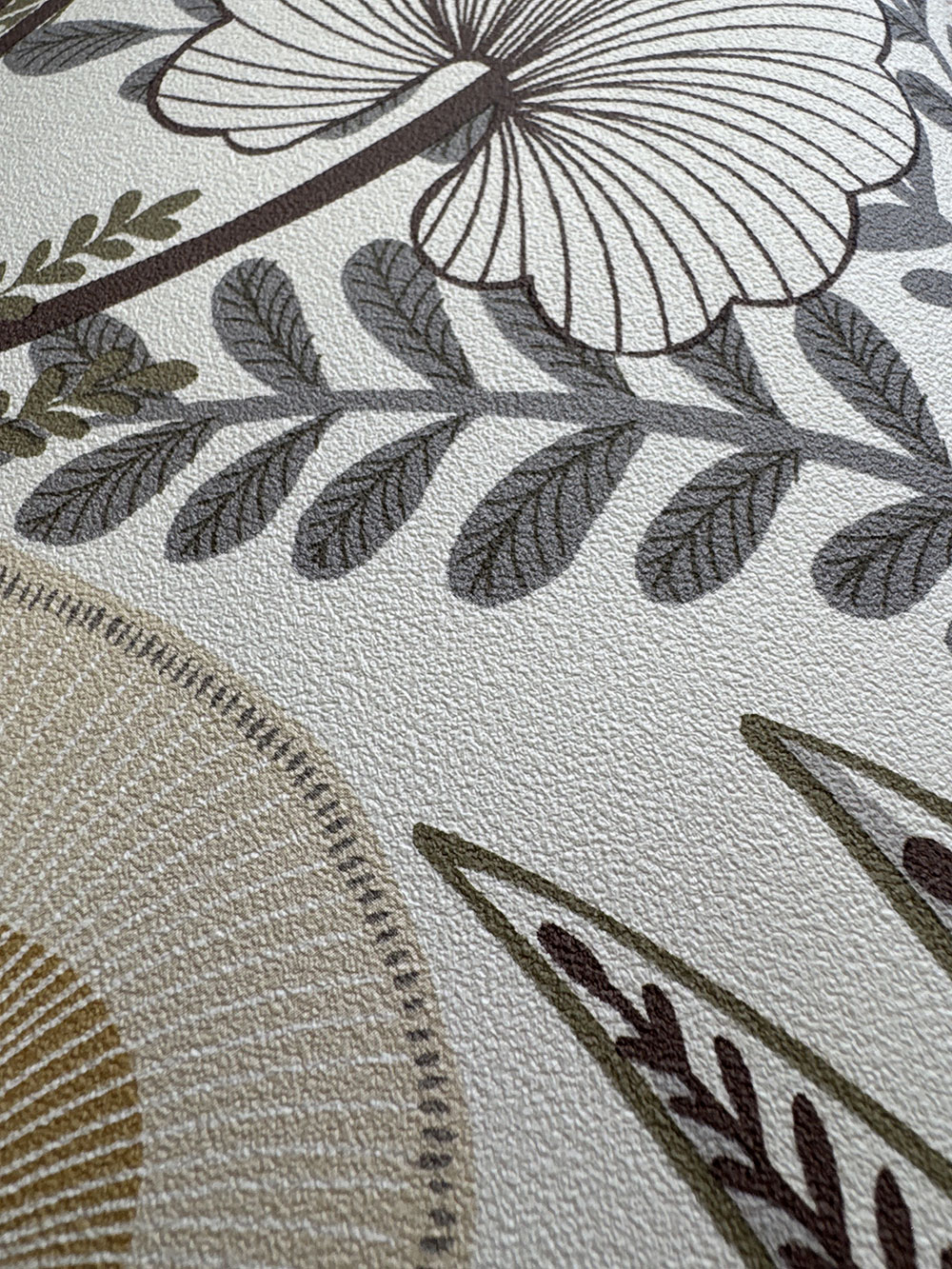 Fehér tapéta, szürke, bézs, zöld és barna árnyalatú levelek mintájával, apró szemcsés textúrával.
