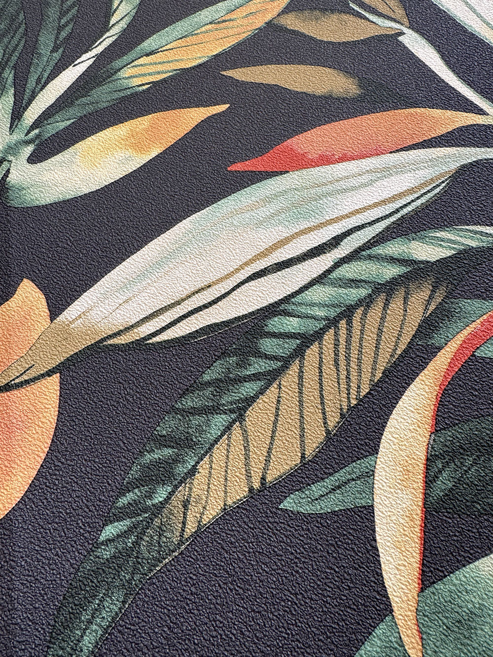 Fekete vlies tapéta, levelek motívumai zöld, barna és narancssárga árnyalatokban.