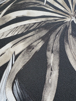 Fekete, vlies tapéta, levelek motívumai barna és szürke árnyalatokban.
