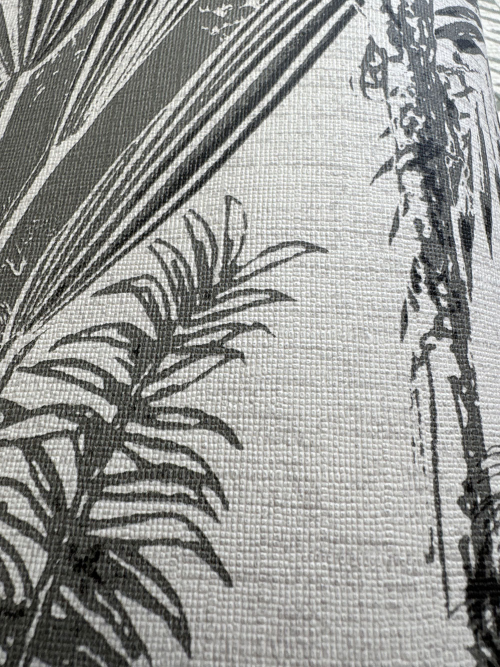 Vlies tapéta, levelek és pálmafák motívumai szürke és fekete árnyalatokban.