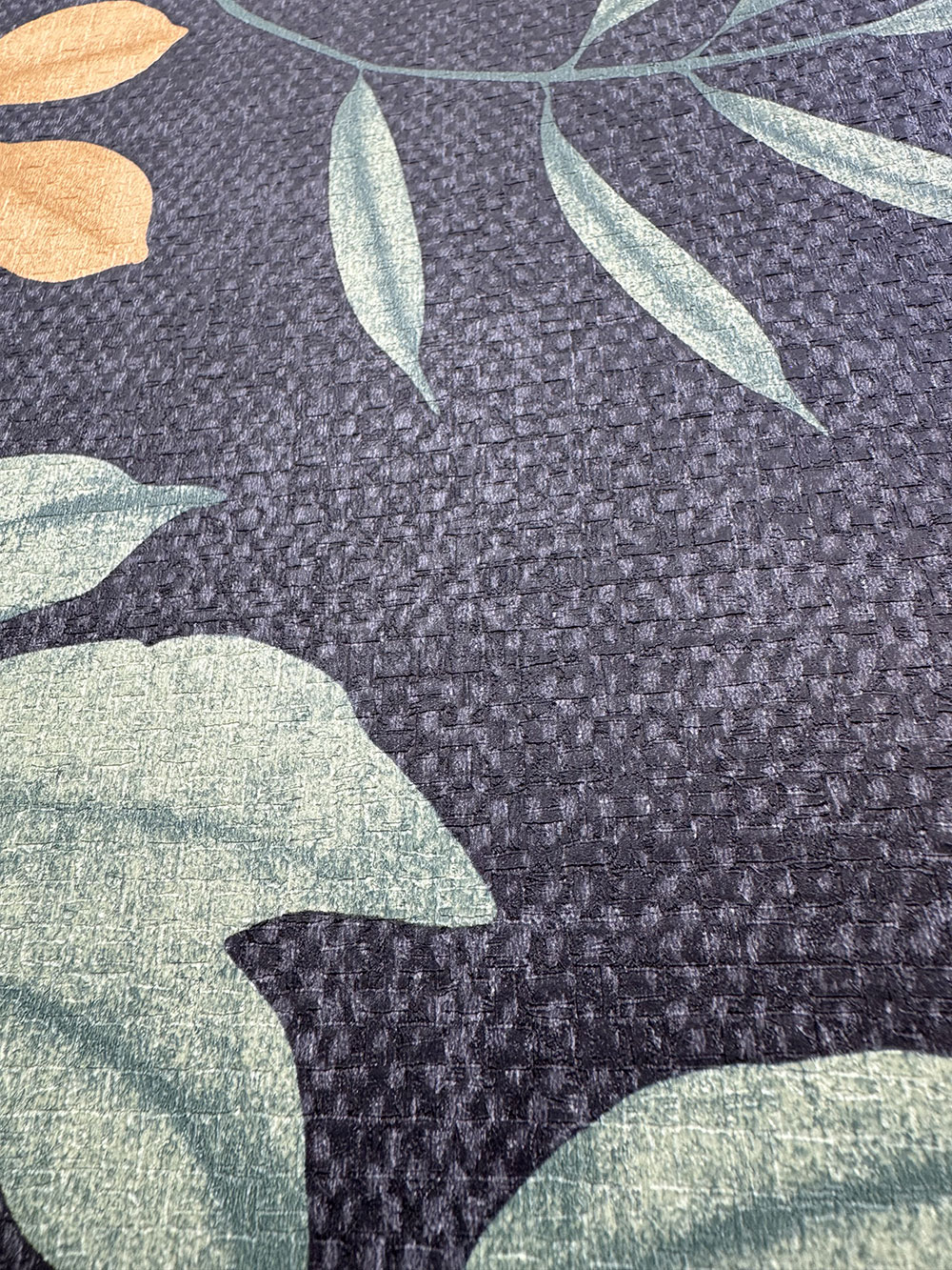 Fekete vlies tapéta, gallyak és levelek zöld és okkersárga árnyalatokban, durvább szövet megjelenése.