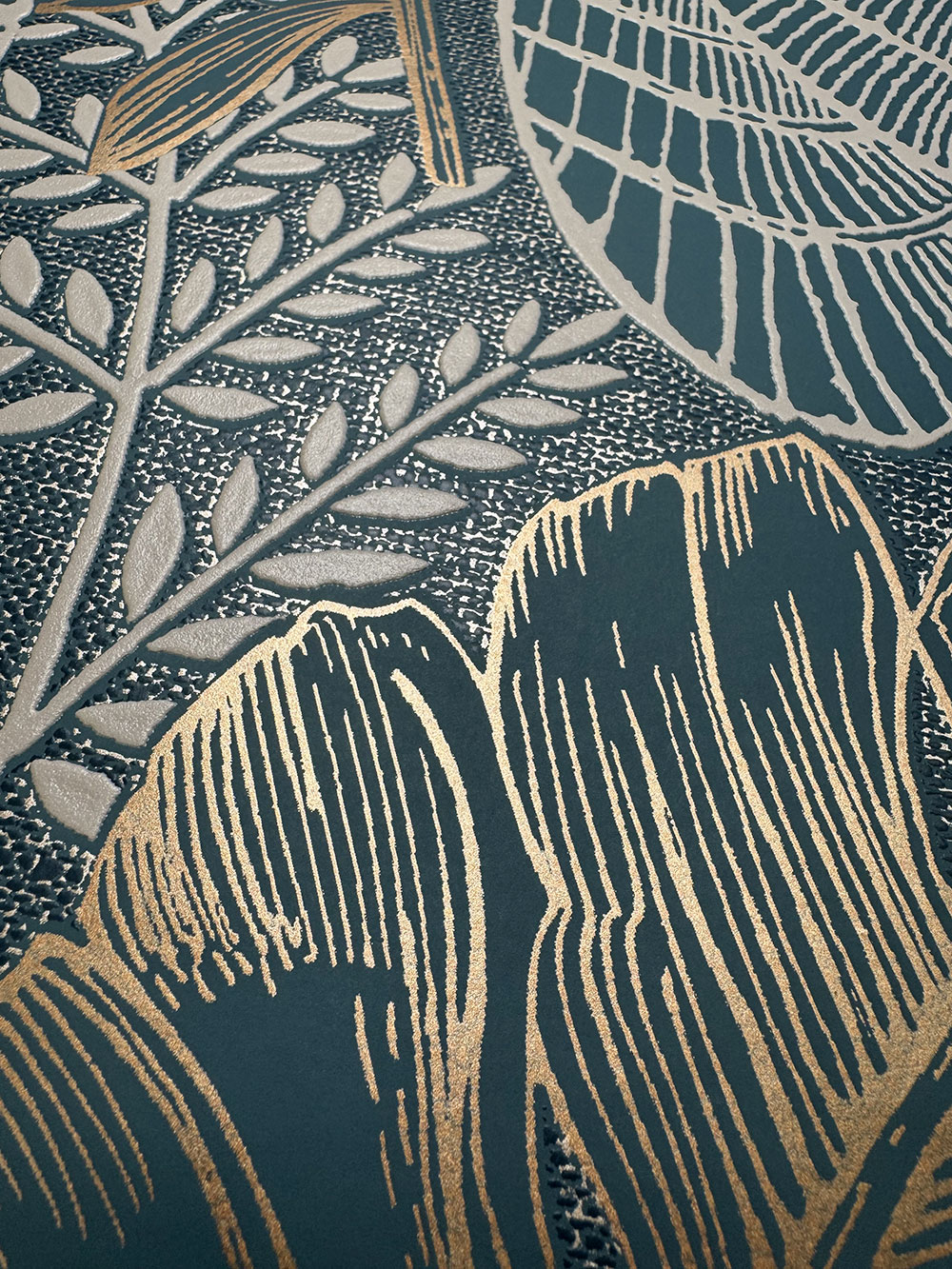 Dombornyomott vlies tapéta, zöld háttér, bézs és arany levelek.