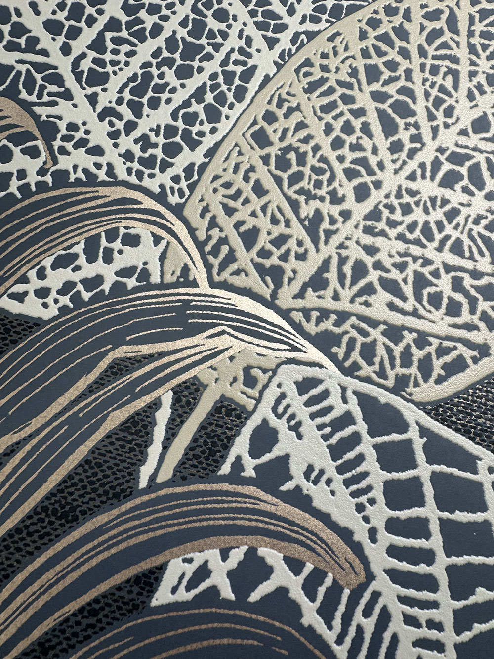 Dombornyomott vlies tapéta, fekete és arany háttér, bézs és arany levelek.