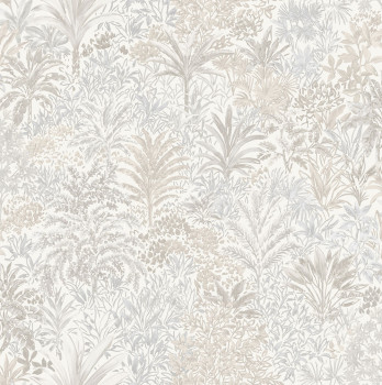 Dombornyomott, félfényes, nem szőtt tapéta vinil felülettel, trópusi fák és levelek motívumaival, krémszínű, lágy szürke és bézs árnyalatokkal.