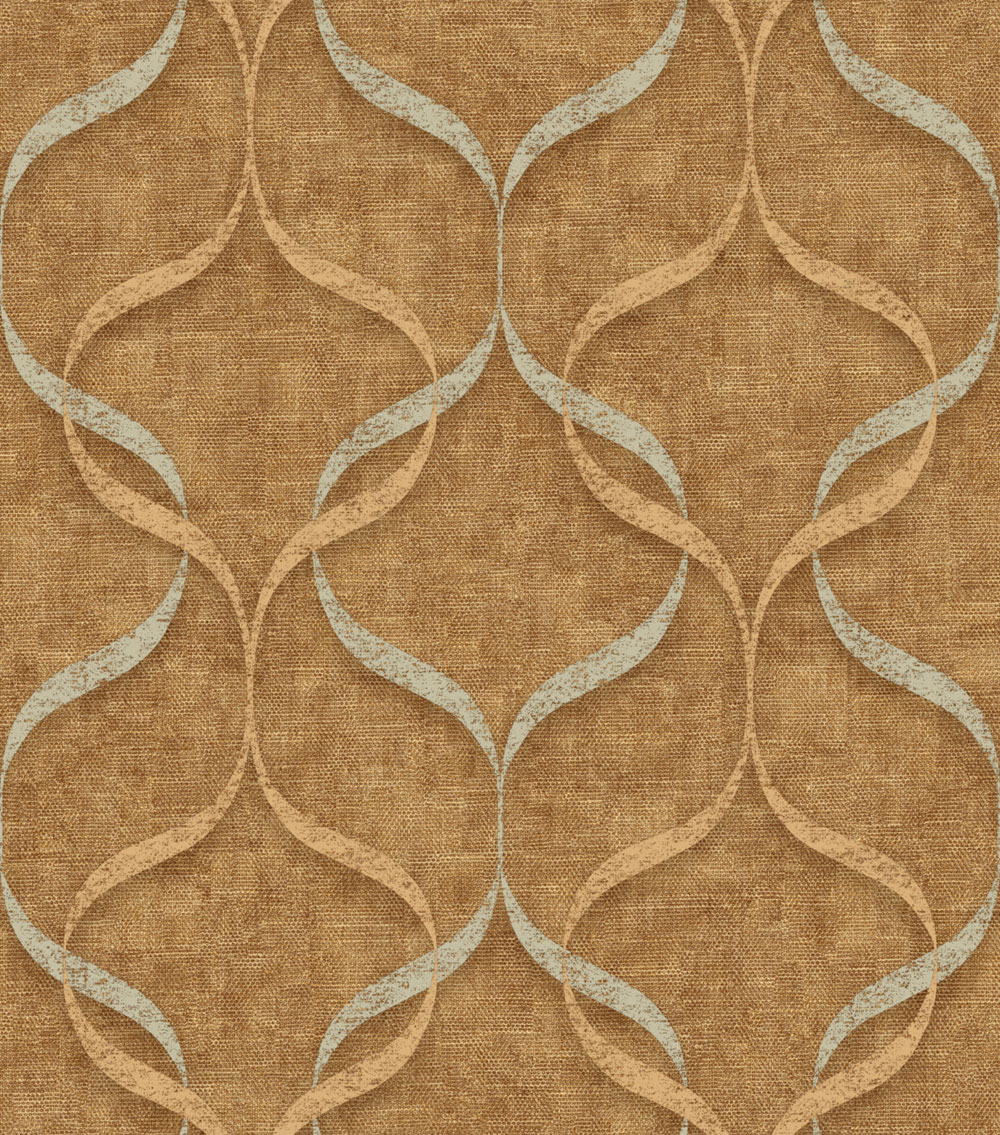 Finoman dombornyomott, gyapjú tapéta vinil felülettel, durvább szövet utánzása okkersárga-arany árnyalatokban, ornamentális minta okkersárga és ezüst színben.
