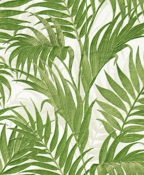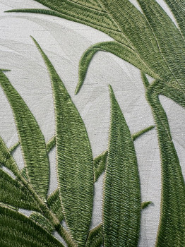 Luxus vlies tapéta vinil felülettel, szürke-fehér háttérrel, dombornyomott zöld levelekkel.