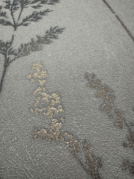 Vlies tapéta vinil felülettel, réti virágok és fűfélék mintájával félfényes barna és barna-szürke-arany árnyalatokban – finom rostos textúra.