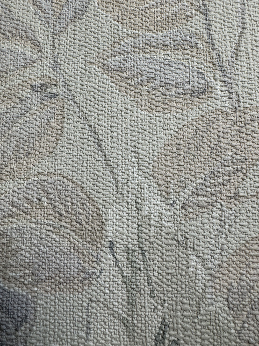 Vlies tapéta vinil felülettel, durvább szövet utánzata, levelek motívumai zöld és szürkés-bézs árnyalatokban.