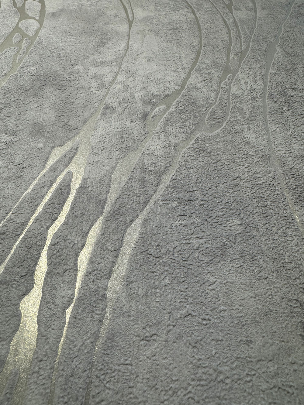 Vlies tapéta vinil felülettel, stukkó/beton utánzat szürke-fehér árnyalatokban, préselt fémes vonal.