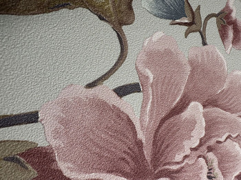 Vlies tapéta vinil felülettel, bézs háttér, rózsaszín, barna és szürkéskék árnyalatú virágok.