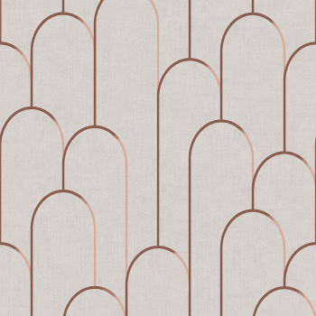 Vlies, szürke-bézs tapéta, vinil felülette, geometrikus minta. Szövet szerkezete, szövet mintá tégla színű, helyenként félfényes réz.
