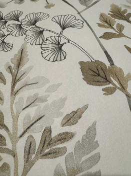 Tapéta, akvarell stílusú páfrányok, fűszálak és levelek mintázatával szürke és barna árnyalatokban.