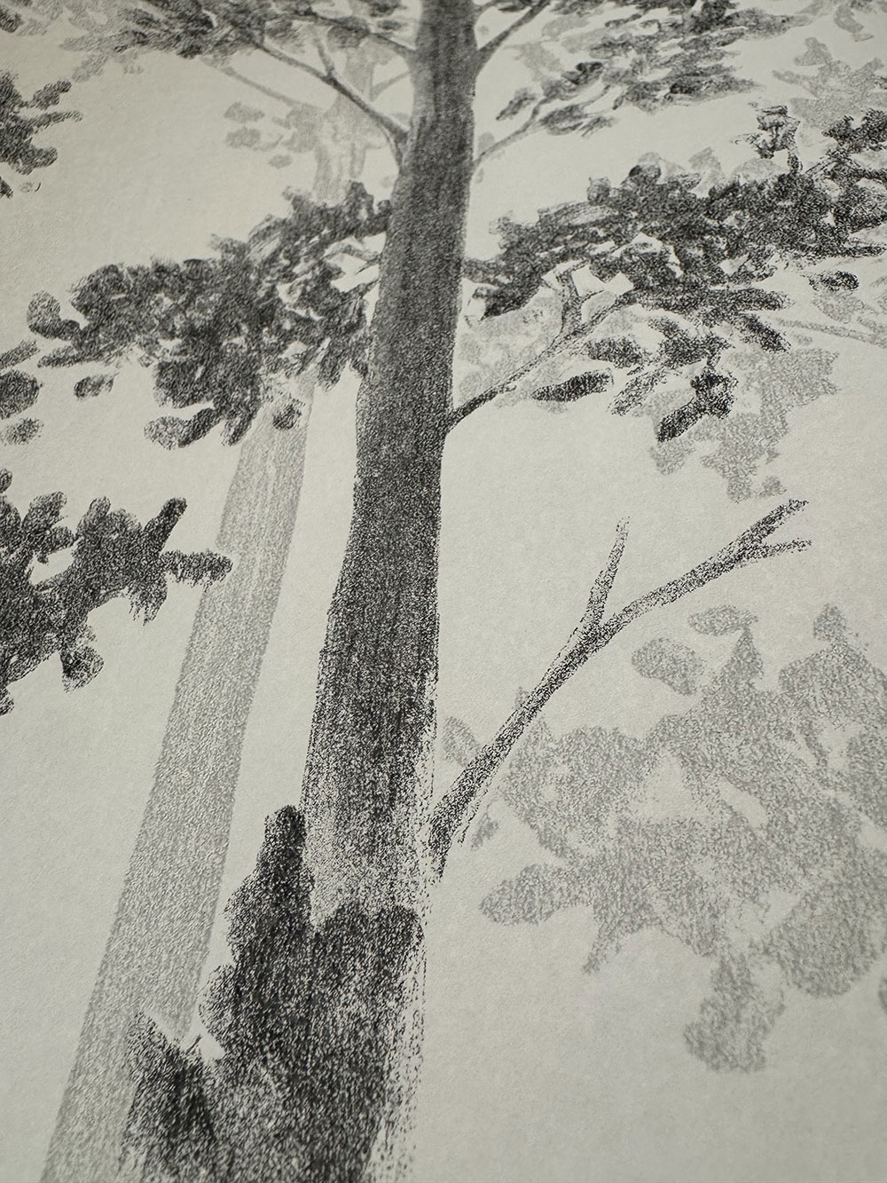 Tapéta fekete-fehér erdő mintával, fákkal.