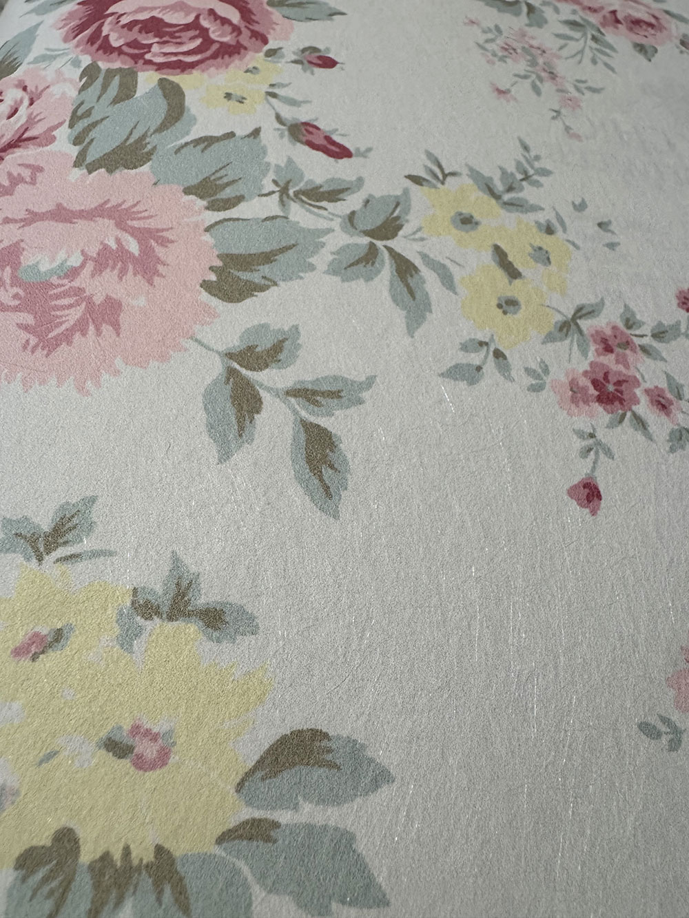 Vlies tapéta falra, pasztellkék alap, virágminta rózsaszín, zöld és sárga árnyalatokban.
