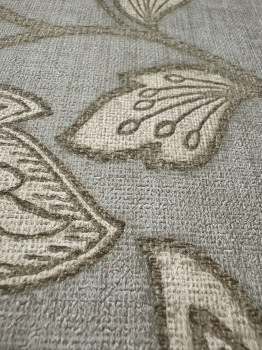 Luxus tapéta vlies hátlappal és vinil felülettel, bézs színű alapon textil struktúrával, ornamentális virágminta barna, lila, púderrózsaszín és okker árnyalatokban.