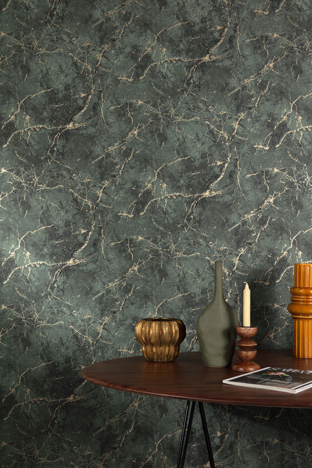 Vinyl felületű tapéta, márványminta zöld és fekete-zöld árnyalatokban, félfényes arany erezeteléssel, finom textúrával.