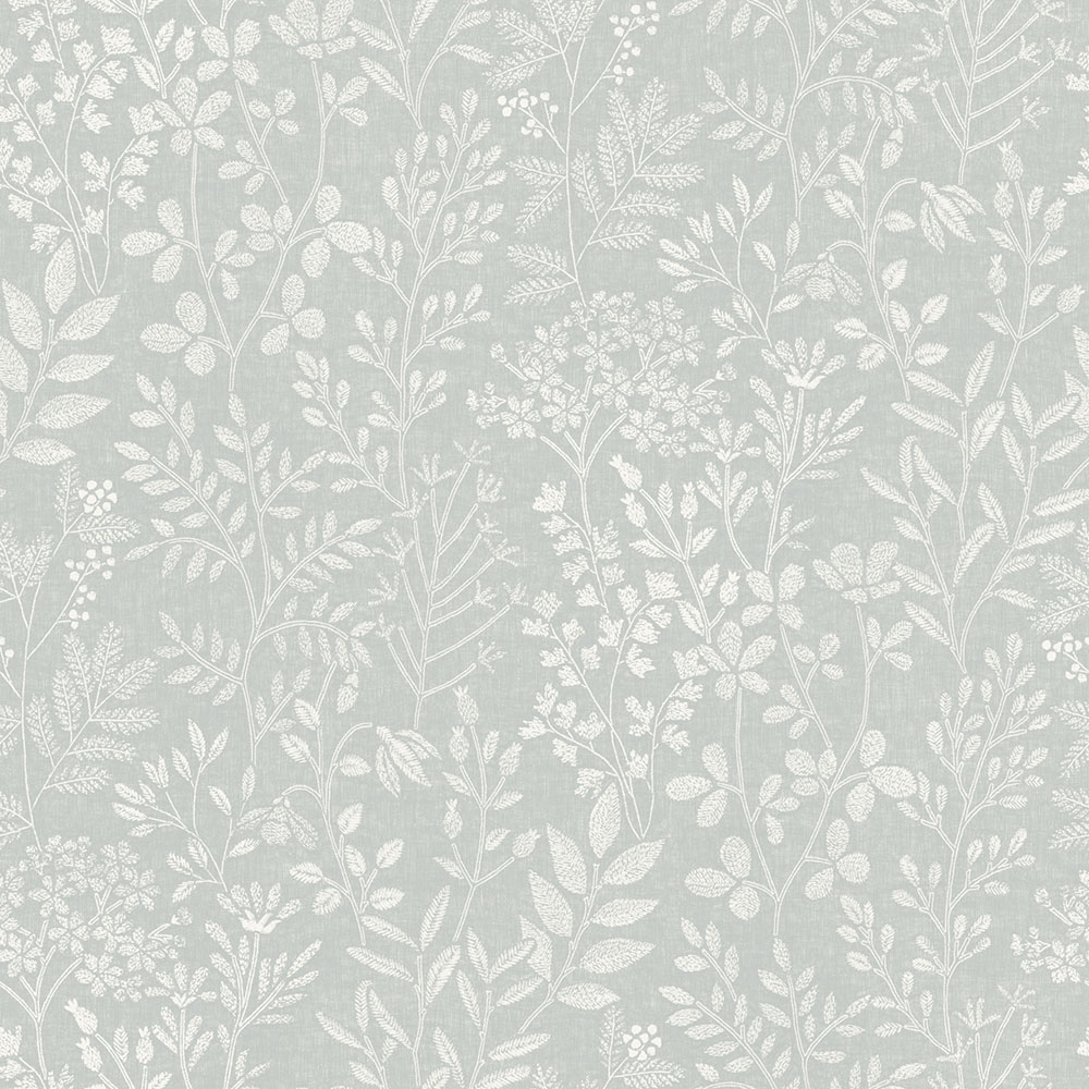 Vinyl felületű tapéta, szürke alap szövethatású textúrával, réti füvek és levelek mintáival.