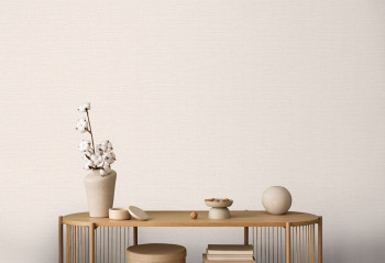 Vinyl felületű tapéta, bézs, szabálytalan vízszintes csíkokkal, apró szemcsés textúrával.