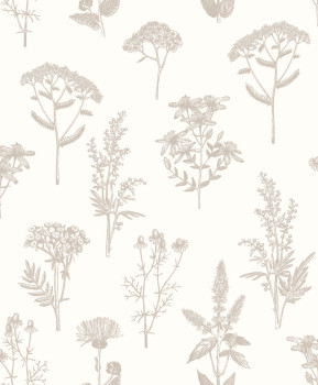 Vinyl felületű tapéta, fehér / elefántcsont alap, fémes ezüst mintával – mezei virágok és füvek.