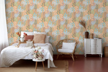 Vinyl felületű tapéta, barna-narancs alap, virág- és levélmintákkal, arany részletekkel, finom textúrával.