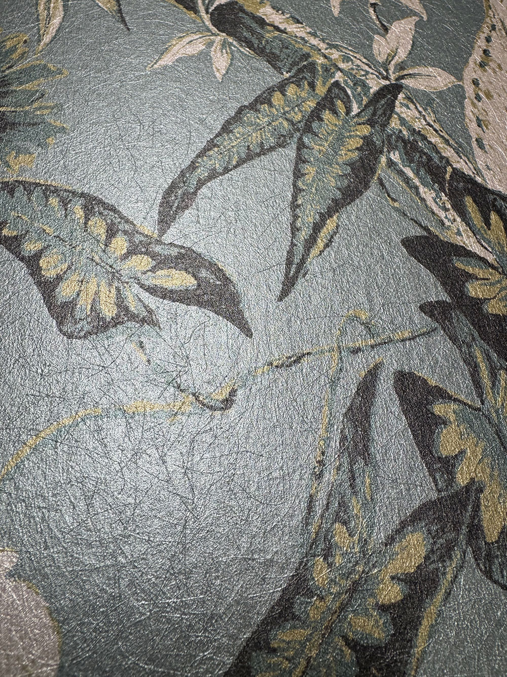 Vlies tapéta, egzotikus madarak motívumával virágok és faágak között, félfényes türkiz alapon, arany-bézs és türkiz mintával, szálas textúrával.