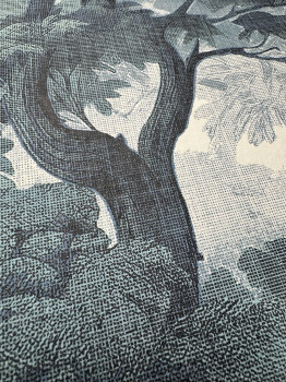 Vlies tapéta erdő és fák motívumával, kék-zöld árnyalatokban, szövet textúra hatással.