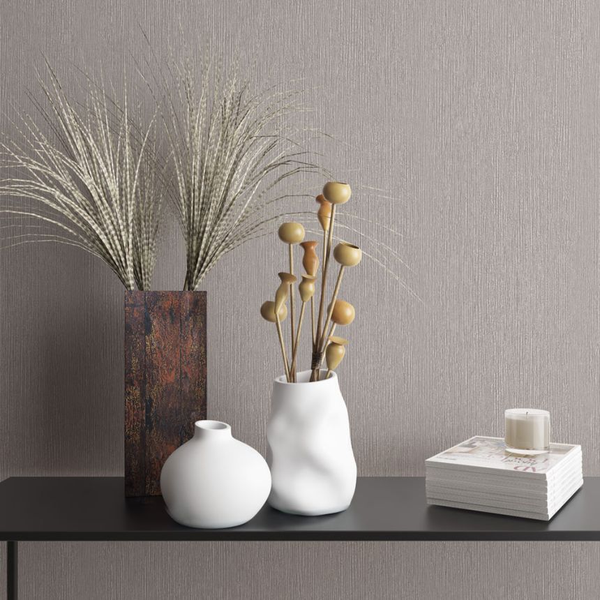 Vinil felületű tapéta, függőleges textúrával, amely a fa erezetét idézi, szürke–barna árnyalatokban.